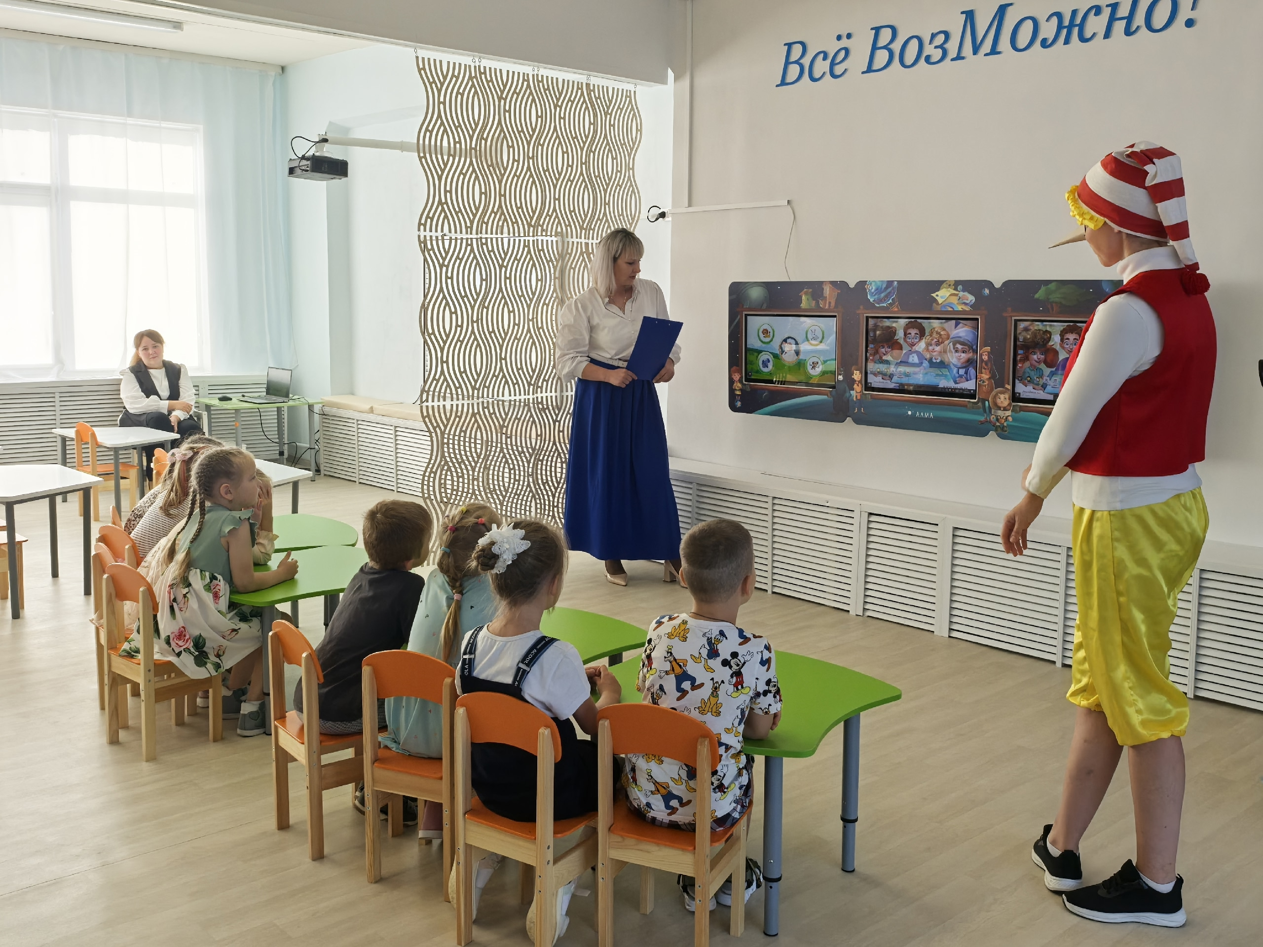 Новое пространство не только яркое и красивое, но и функциональное. Здесь есть интерактивная панель, на которой одновременно могут работать три ребёнка, интерактивная доска с программным обеспечением по дошкольному образованию, интерактивная песочница, коврик для нейрогимнастики и всевозможный дидактический материал, помогающий психологу, логопеду и дефектологу. Мечта педагогов и воспитанников детского сада воплотилась благодаря программе «Норникеля» «Мир новых возможностей».